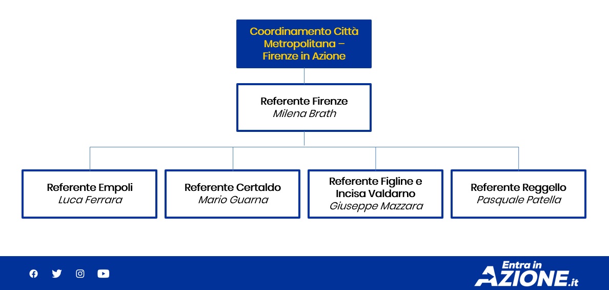 È l’annuncio di Milena Brath, referente cittadina di Firenze In Azione e alla guida del Coordinamento Città Metropolitana Firenze In Azione. Gli altri componenti: Luca Ferrara, referente del Comitato di Empoli, Giuseppe Mazzara, referente del Comitato di Figline e Incisa Valdarno, Mario Guarna, referente del Comitato di Certaldo, Pasquale Patella, referente del Comitato di Reggello.