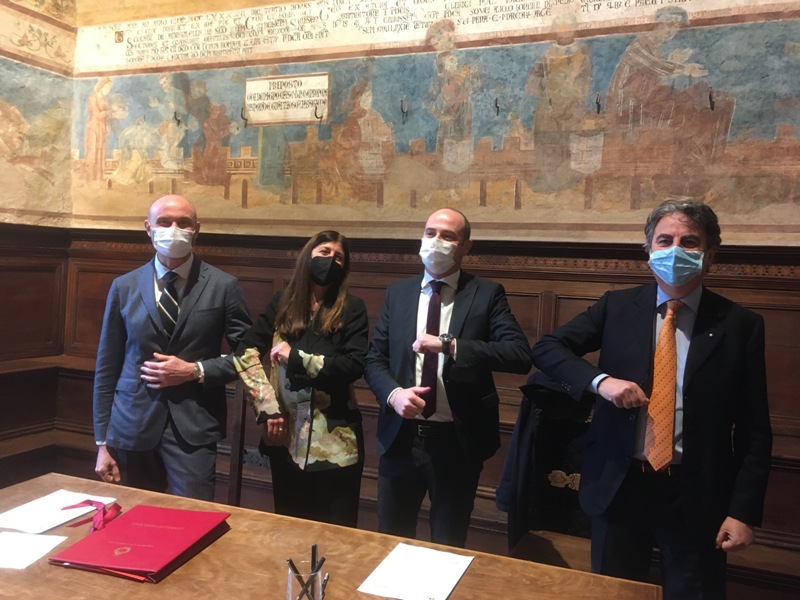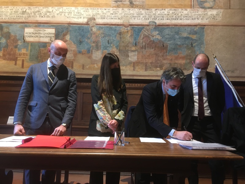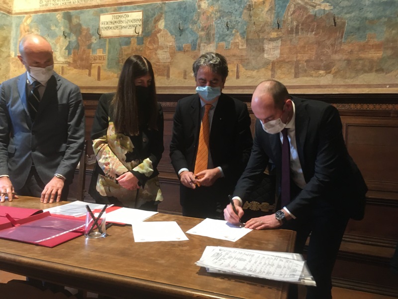 A suggellare il nuovo futuro la firma del contratto in concessione per 69 anni all’aggiudicatario del bando per il project financing tenutasi oggi nella sala Dante del Palazzo Comunale alla presenza del sindaco di San Gimignano Andrea Marrucci e del presidente di Opera Laboratori Beppe Costa.
