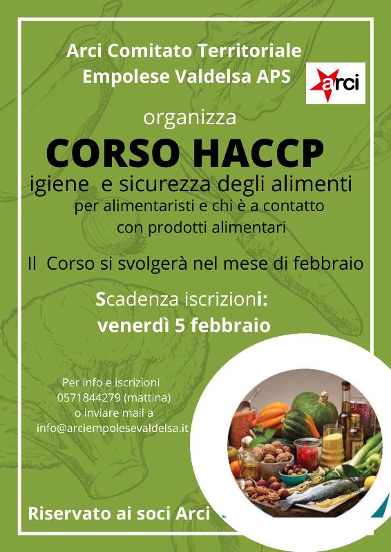 Partirà a fine febbraio il Corso HACCP organizzato da Arci Comitato Territoriale Empolese Valdelsa APS. Il corso, riservato esclusivamente ai soci Arci, riguarda le normative sull’igiene e la sicurezza degli alimenti e affronta tematiche riguardanti la conservazione degli alimenti, la sanificazione e igienizzazione delle strutture e attrezzature, offrendo inoltre nozioni di microbiologia.