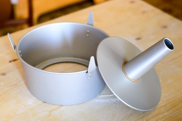 Un'altra particolarità di questa bellissima torta è il suo stampo, infatti non possiamo realizzarla se non abbiamo uno stampo da Chiffon Cake, è un contenitore in alluminio alto, ha tre piedini e una base rimovibile. I piedini hanno la funzione di fare passare l'aria quando la torta è capovolta.