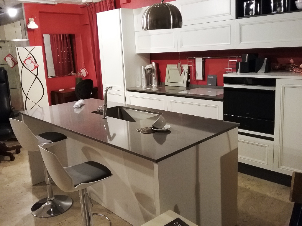 Mod. Magistra in legno laccato bianco a poro aperto con piano lavoro in agglomerato al quarzo cm.390 + isola cm.220x96 completa di tutti gli elettrodomestici Prezzo Listino € 18.072,00. svendita € 9.036,00