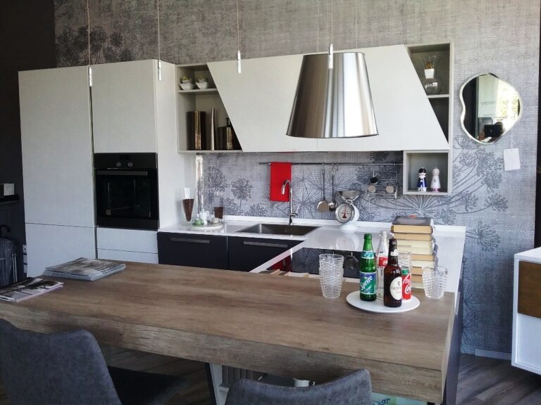Mod. Mia in laminato effetto malta con piano lavoro in agglomerato bianco, cm.360x225 con penisola 170x70 completa di frigo-congelatore da 75 (400 litri), forno, piano cottura induzione, lavastoviglie, cappa isola e lavello. Prezzo Listino € 11.478,00. svendita € 7.900,00