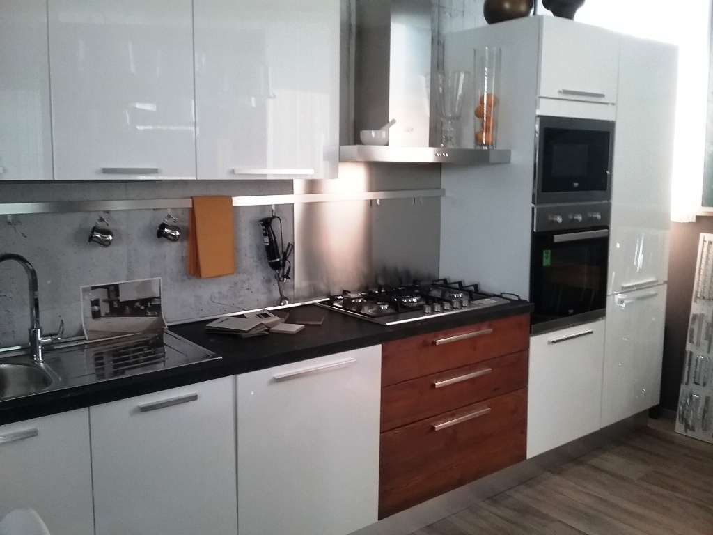 Mod. Mirabilia ante in laminato lucido pet e cassettiera in legno vecchio completa di: lavello, cappa, lavastoviglie, piano, cottura, forno, microonde, frigo-congelatore. prezzo lancio €.3.500,00
