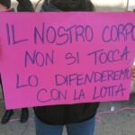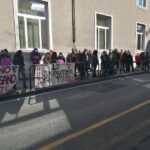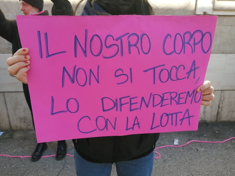 "Il nostro corpo non si tocca lo difenderemo con la lotta", questo è uno degli slogan che si leggono sui cartoncini rosa che erano presenti alla manifestazione che l'associazione di attiviste 'Non Una di Meno' Firenze ha organizzato questa mattina, 13 febbraio, a Prato in via del Seminario davanti al bar di Marco Camuffo, l'ex appuntato dei carabinieri condannato, come il suo