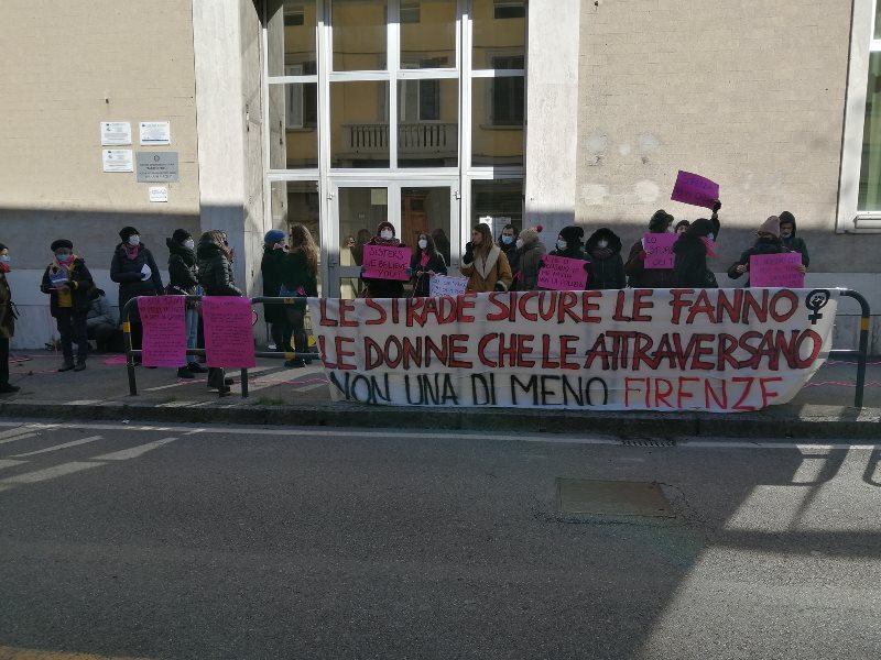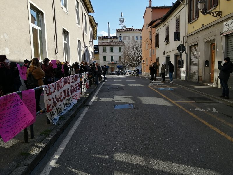 "Il nostro corpo non si tocca lo difenderemo con la lotta", questo è uno degli slogan che si leggono sui cartoncini rosa che erano presenti alla manifestazione che l'associazione di attiviste 'Non Una di Meno' Firenze ha organizzato questa mattina, 13 febbraio, a Prato in via del Seminario davanti al bar di Marco Camuffo, l'ex appuntato dei carabinieri condannato, come il suo