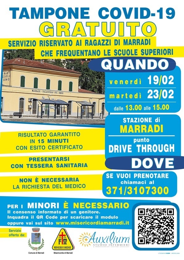 Screening anticontagio Covid gratuito per gli studenti marradesi che frequentano le scuole superiori in Romagna e si spostano con i mezzi pubblici. A mettere in campo l'iniziativa è l'Amministrazione comunale con la Misericordia locale e lo Studio Auxilium di Borgo San Lorenzo.