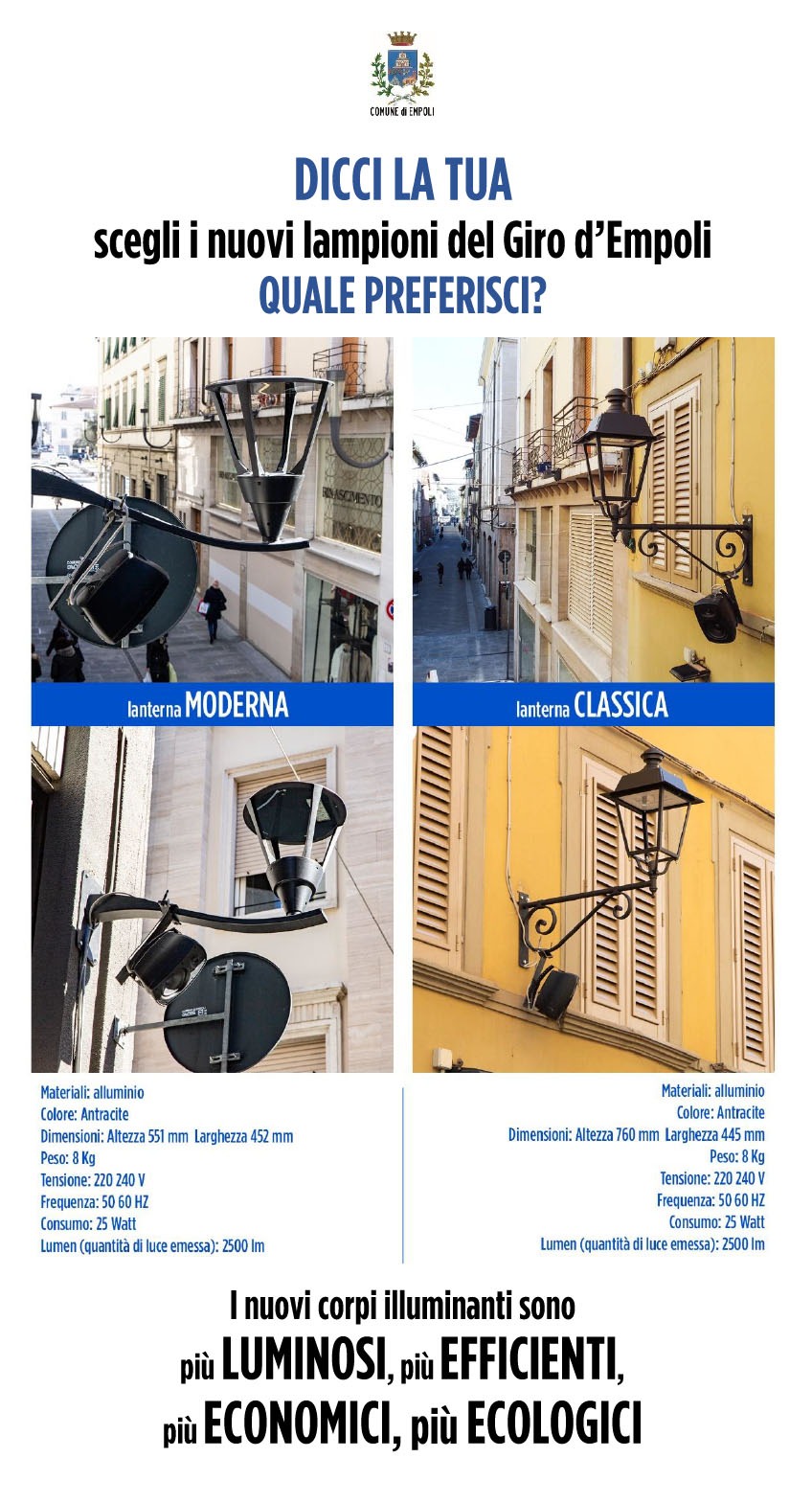 L’amministrazione comunale ha deciso di proporre alla cittadinanza la scelta tra due modelli di ‘lanterna’ che la ditta appaltatrice, la Citelum, a sua volta ha presentato.
