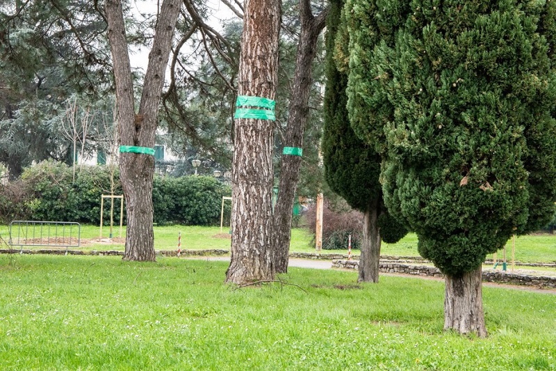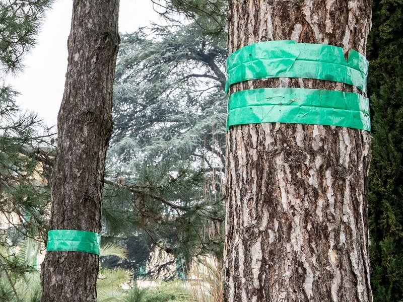 Dove sono stati individuati i nidi, per la prima volta, sono stati applicati per la prima volta i ‘Tree-Band’, una sorta di collare adesivo di colorazione verde che arresta la discesa degli insetti dal tronco dell’albero al terreno.