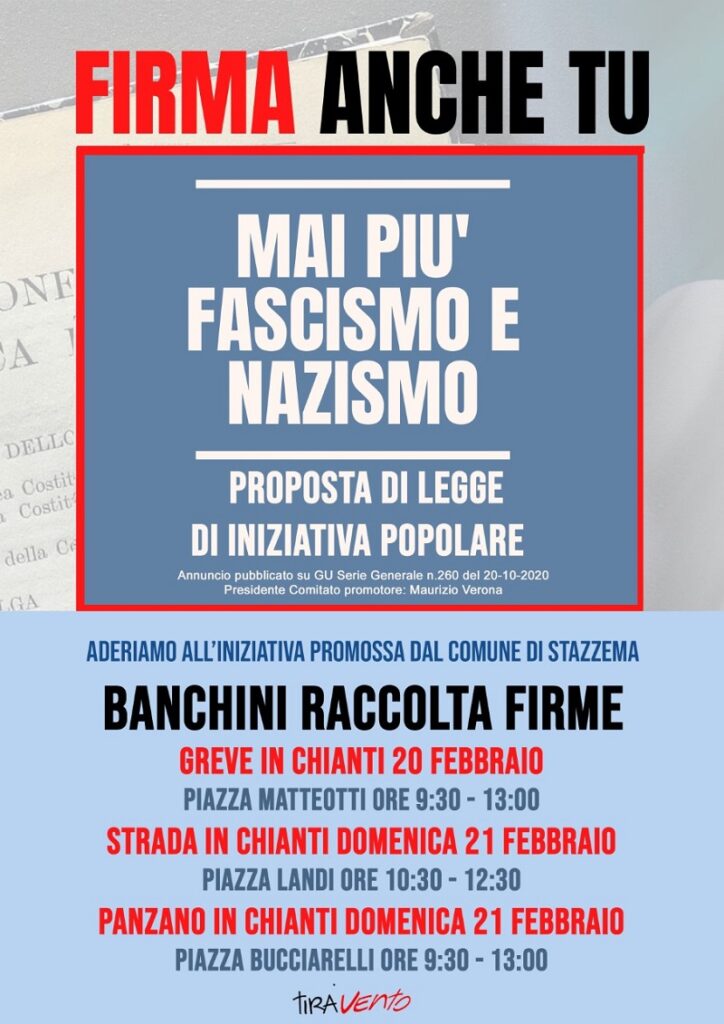 L’Associazione Tiravento aderisce convintamente all’iniziativa promossa dal Sindaco di Stazzema, Maurizio Verona, che ha proposto la presentazione al Parlamento di una Legge per contrastare iniziative di propaganda e diffusione di ideologie fasciste e naziste anche attraverso la rete e con la vendita di gadget e oggetti celebrativi dei regimi.