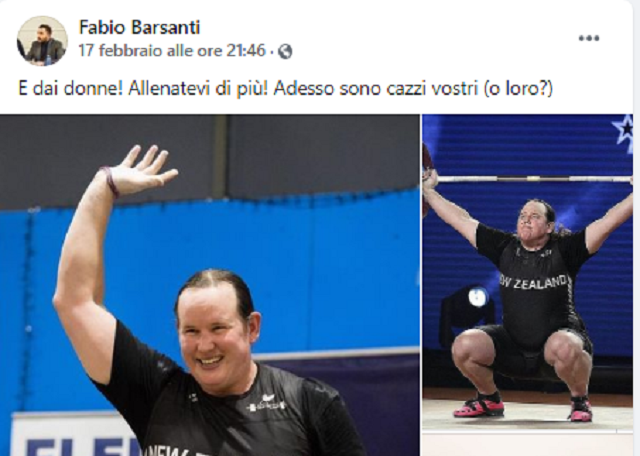 Il consigliere comunale di Casa Pound a Lucca, ha condiviso sul proprio profilo Facebook un post transfobico contro l'atleta trans Lauren Hubbard (vincitrice di due medaglie d'oro nei campionati mondiali di sollevamento peso), aggiungendo un commento da bar altrettanto offensivo e greve.