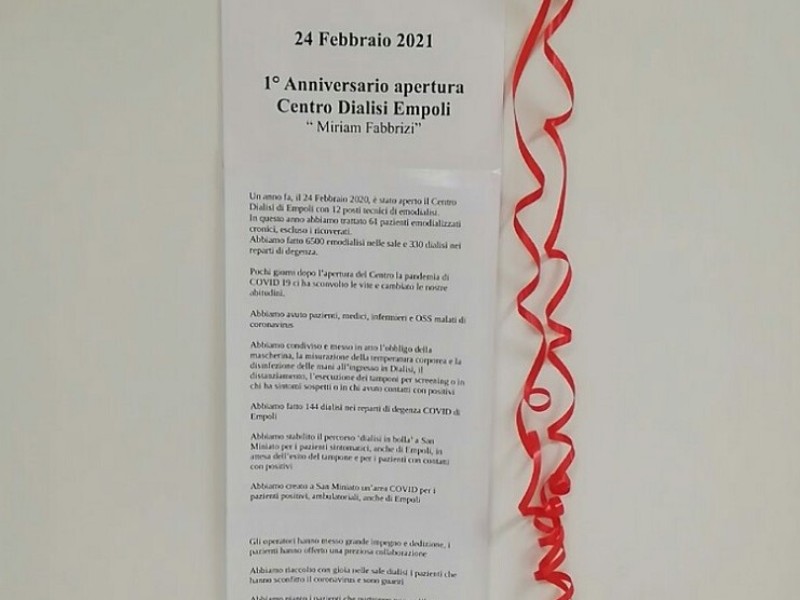 Un anno fa, il 24 febbraio, è stato aperto il Centro Dialisi di Empoli, con 12 posti tecnici di emodialisi. Ieri mattina il personale sanitario del reparto, diretto dalla dottoressa Lucia Dani, ha voluto ricordare la giornata con una torta virtuale ed un ringraziamento, appeso all’ingresso, rivolto a tutti gli operatori sanitari.
