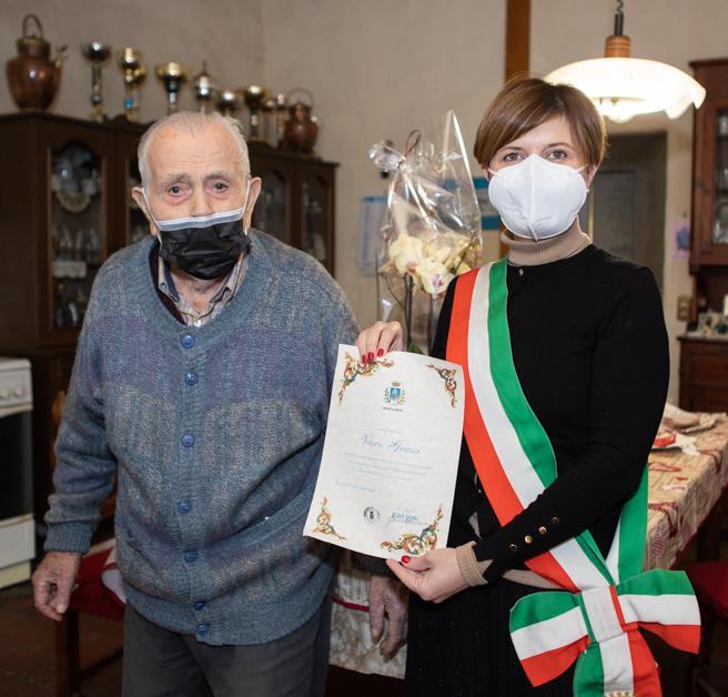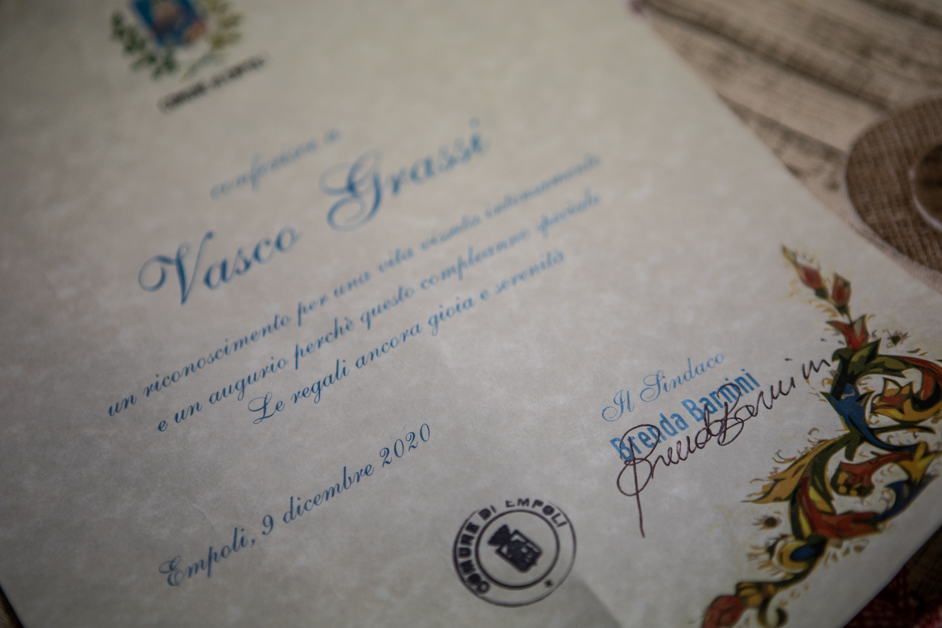 Quarto di quattro fratelli, mamma empolese doc, Vasco Grassi era il più grande. Sposato nel 1951, con Antonia Chiarugi, cortenovina, hanno avuto una figlia Donella, docente alla scuola secondaria di primo grado ‘Busoni’ di Empoli. Proprio la figlia racconta la vita secolare del padre: «Ha ancora vivo il ricordo della guerra. La sua memoria lo riporta sempre lì al giorno in cui partì militare nel ’40 per Napoli dove rimase fino all’8 settembre 1943. Riuscì a salvarsi ai molti bombardamenti dove persero la vita tanti suoi amici. Mio padre ha condotto una vita di fatiche, voleva che studiassi e non mi hanno mai fatto perdere un minuto di insegnamento e essere qui alle Busoni per lui è stato davvero importante. Muratore di professione. La mamma è mancata nel 2013, erano sposati dal ’51. Uniti fino all’ultimo. Lui le ha sempre portato il caffè in camera, ogni mattina. Un uomo che non ho mai visto arrabbiato, sempre paziente, di spirito, che si è rialzato da solo. Ha vissuto gli anni della guerra, della ricostruzione, il boom economico ed è molto attento a questa emergenza sanitaria per il virus».