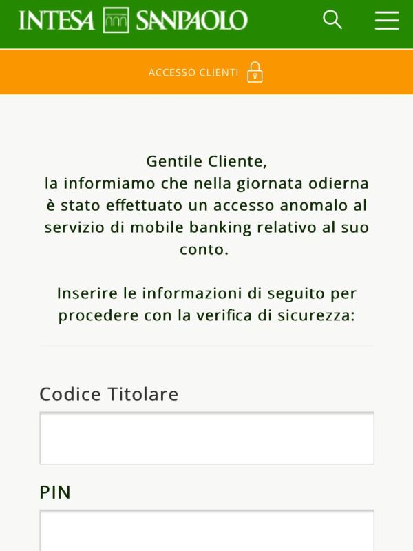 A quel punto, il cliente, è portato a cliccare il link. Ed ecco cosa succede dopo. La seconda schermata sembra essere anch'essa quella ufficiale della banca. Il cliente è invitato a compilare i dati. Nel momento in cui si procede in tal senso, arriva una telefonata da un sedicente addetto al servizio frode di Intesa che chiede al malcapitato di leggere un codice che è stato inviato poco prima. Nel caso si sollevassero obiezioni il truffatore è perfettamente preparato a superarle e carpisce la fiducia della vittima della truffa facendole notare che l'sms arriva "proprio dalla banca".