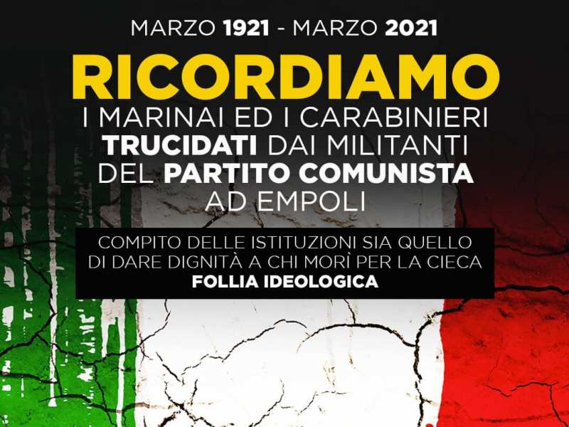 Soltanto una delegazione di Fratelli d’Italia Empolese Valdelsa, insieme ai Consiglieri Comunali di Empoli: il Capogruppo Andrea Poggianti, Simona Di Rosa e Federico Pavese, si è recata presso il Cimitero della Misericordia di Empoli per commemorare il centenario dai tragici fatti del 1921, in cui i militanti del Partito Comunista si scagliarono contro 46 Marinai, scortati da 18 Carabinieri, che avevano il compito di riattivare le linee ferroviarie interrotte dagli scioperi di quei giorni a Firenze, scambiandoli per fascisti.