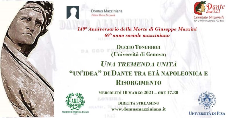 Il 10 marzo, anniversario della morte di Giuseppe Mazzini, si terrà, dopo l’interruzione dello scorso anno dovuto all’irrompere improvviso dell’epidemia di Covid, la cerimonia di apetura dell’anno sociale mazziniano, che sarà dedicata quest’anno a Dante.