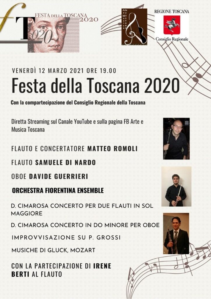 Venerdì 12 marzo alle ore 19.00 si festeggerà la Festa della Toscana con un Concerto in Streaming eseguito presso l’Antico Chiesino di Narnali a Prato e trasmesso sul Canale YouTube e la pagina Facebook Arte e Musica Toscana. Il Concerto dal titolo “La Toscana terra di libertà, di musica e di digitalizzazione da Mozart a Grossi” avrà come solisti Matteo Romoli al flauto e Davide Guerrieri all’oboe entrambi prime parti di numerose orchestre della Toscana e docenti presso il Liceo Musicale “Cicognini Rodari” di Prato; ci saranno come solisti anche i flautisti Samuele Di Nardo ex allievo del Liceo Musicale di Prato premiato in diversi concorsi internazionali e Irene Berti attualmente allieva del Liceo Musicale di Prato. I solisti saranno accompagnati dall’Orchestra Fiorentina Ensemble. Il Concerto è realizzato con la compartecipazione del Consiglio Regionale della Toscana. Verranno interpretati due capolavori di Cimarosa, il Concerto per due flauti e il Concerto in do minore per oboe, la celebre Danza degli spiriti beati di Gluck per flauto, una Fantasia su Il Flauto Magico di Mozart per quartetto di fiati e infine un’improvvisazione ispirata a Pietro Grossi.