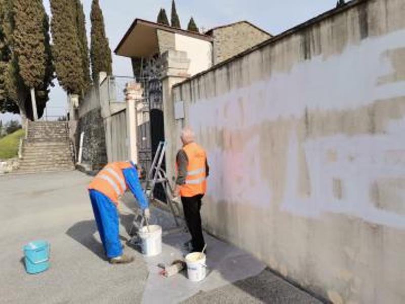 Durante l’intervento sui muri esterni al cimitero di San Vincenzo a Torri, effettuato da tre volontari opportunamente distanziati nel rispetto delle norme anticovid, sono state cancellate alcune scritte fatte da ignoti, con la riverniciatura finale delle pareti.
