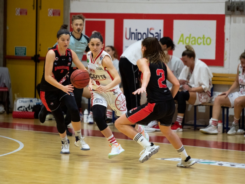 Premasunac muove il tabellino biancorosso ed entra in ritmo anche Smalls con 5 punti: 4-7. Di Ravelli dalla lunga il 6-10 ed ancora Smalls scatenata con 10 punti sui primi 15 della Scotti. Al 10' siamo 15-21 e si riparte con Premasunac a segno e con la zona ordinata da coach Cioni. Lucchesini mette la tripla del 17-26 che ancora Premasunac ribadisce per il 17-28, primo tentativo di fuga. Smalls continua a martellare dalla lunga (19-30), ma Marinkovic scuote Vigarano con due triple in pochi secondi che obbligano coach Cioni al timeout sul 25-33 al 6'. Anche Premasunac va in doppia cifra con due bei movimenti da sotto ma Yurkevicius conferma il buon momento della squadra di casa a cui prova a mettere un freno Chagas con una bella tripla.