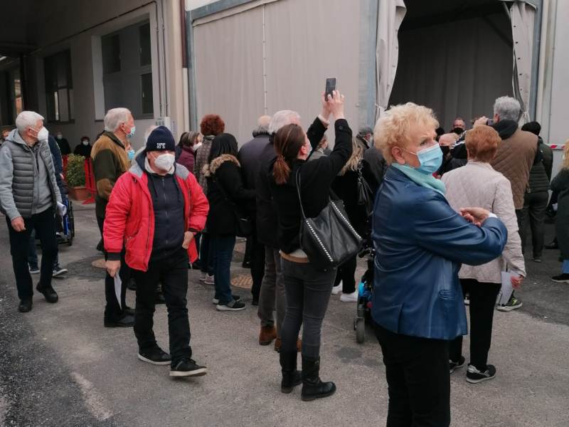 Il personale di vigilanza del Centro vaccinale ha provveduto a distribuire le persone in attesa nei due accessi alla struttura in modo da permettere l’afflusso in modo regolare.