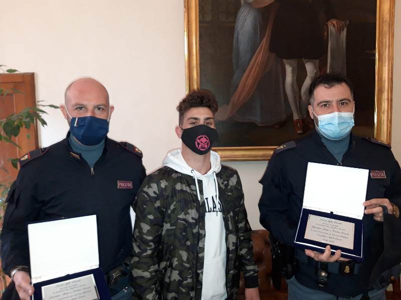 Alla presenza del Questore Costantino Capuano, accompagnati dal dirigente dell’Ufficio Prevenzione Generale e Soccorso Pubblico Fausto Camisa, stamani Luciano e Pietro hanno così potuto ricevere personalmente, durante un breve ma intenso incontro, il grazie da parte del giovane e della sua famiglia. Nell’occasione il ragazzo ha inteso stigmatizzare il nobile gesto anche con la consegna ai due Agenti di una targa ricordo.