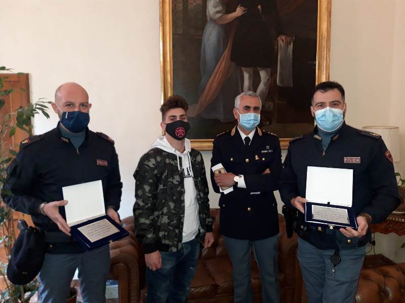 Alla presenza del Questore Costantino Capuano, accompagnati dal dirigente dell’Ufficio Prevenzione Generale e Soccorso Pubblico Fausto Camisa, stamani Luciano e Pietro hanno così potuto ricevere personalmente, durante un breve ma intenso incontro, il grazie da parte del giovane e della sua famiglia. Nell’occasione il ragazzo ha inteso stigmatizzare il nobile gesto anche con la consegna ai due Agenti di una targa ricordo.