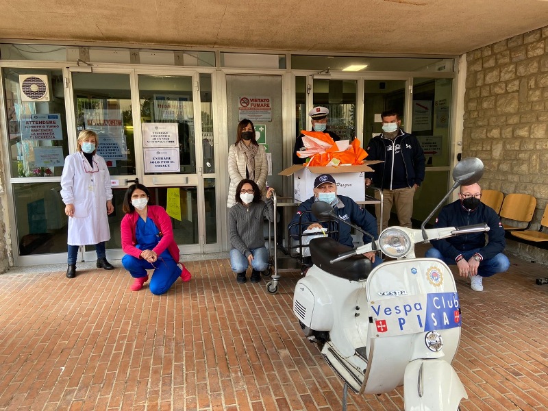 Sebbene a ranghi ridotti (causa misure anti-contagio) questa mattina il Consiglio Direttivo del Vespa Club di Pisa si è ritrovato davanti al Comune e qui una loro delegazione è partita insieme ai Vigili Urbani alla volta dell’Oncoematologia pediatrica dell’AOUP e un’altra delegazione con i Vigili Urbani è partita per raggiungere la Fondazione Stella Maris di Calambrone, per portare ai bambini ricoverati dei dolcissimi pensieri. A causa delle misure anti-Covid la consegna è avvenuta nell’area di ingresso dopo il triage.
