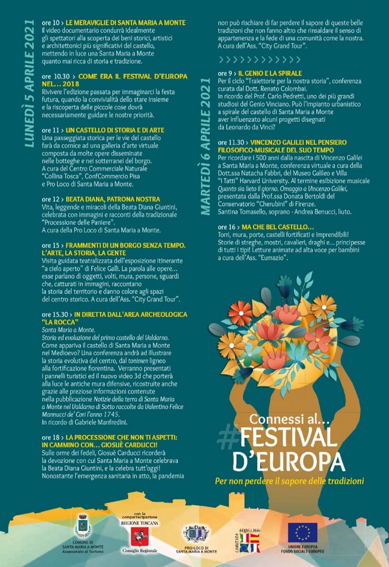 “Abbiamo pensato di creare vari contributi video che andranno ad approfondire le particolarità storico-artistiche del centro storico di Santa Maria a Monte, con le sue tradizioni, l’arte, la storia, i suoi personaggi illustri che ci accompagneranno in una due giorni speciale, per rimanere insieme anche se “a distanza”. Siamo sicuri che la bellezza del nostro territorio sia apprezzabile anche in maniera virtuale e in attesa di riprende le iniziative nelle forme consuete invitiamo tutti a non perdere questa occasione.” Rimani connesso al… Festival d’Europa 2021! 5 e 6 aprile sulla pagina facebook “il borgo che vorrei”. Così l’Assessore al Turismo Elisabetta Maccanti.