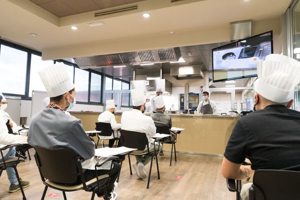 L’organizzazione degli spazi all’interno della Scuola, un enorme open space polifunzionale con pareti trasparenti mobili e insonorizzate, rende l’idea di un luogo dove la tradizionale separazione didattica fra teoria e pratica viene definitivamente archiviata. Ciascuna classe è a numero chiuso con solo sedici posti, per garantire a ogni allievo la propria postazione, un rapporto diretto e continuativo con i docenti e la possibilità di mettere realmente le mani in pasta ogni giorno. Saranno di fatto i primi 32 giovani ristoratori e pasticceri con un diploma in ristorazione, o in pasticceria post-covid.