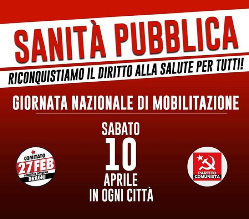 Il Comitato 27 Febbraio, promosso dal Partito Comunista, Patria Socialista, Associazione e rivista Cumpanis, Circolo Culturale Proletario, Rivista Politica Gramsci Oggi, Associazione Politica M-48, Movimento per Rinascita del P.C.I e l'unità dei Comunisti, Spread IT, lancia una grande iniziativa unitaria, con presidi in tutte le principali città italiane, in difesa della sanità pubblica.