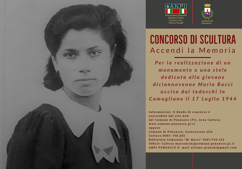 Il Comune di Ponsacco, in collaborazione con A.N.P.I Ponsacco Sezione “Vittorio Venagli”, in occasione del 77° anniversario della Resistenza e della Lotta per la Liberazione, promuove un concorso per la realizzazione di un’opera scultorea dedicata alla memoria di Maria Bacci, una giovane diciannovenne ponsacchina barbaramente uccisa dai tedeschi in ritirata il 17 luglio 1944.