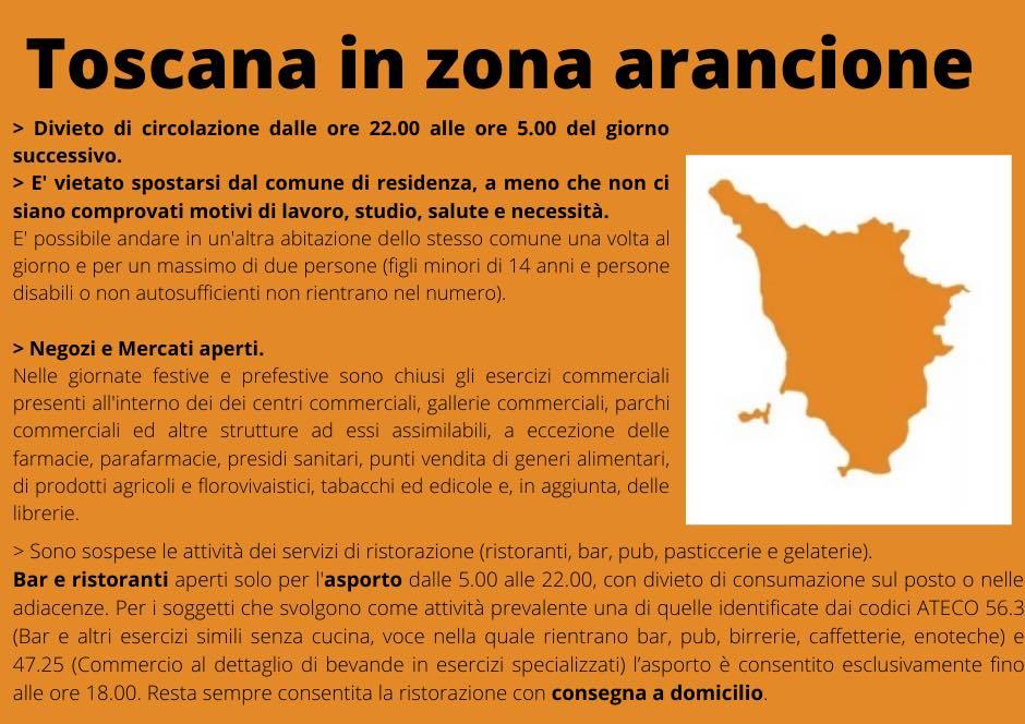 La Toscana, per atto del Ministro della Salute, è in zona arancione da lunedì 12 Aprile. Permangono in zona rossa fino alle ore 14 di Sabato 17 Aprile le Province di Firenze e Prato, i comuni di San Miniato, Montopoli in Val d’Arno, Santa Croce sull’Arno, Castelfranco di Sotto parte della Provincia di Pisa ma compresi nella zona socio sanitaria Valdarno Empolese Valdelsa, i comuni di Poggibonsi, San Gimignano, Colle di Val d’Elsa, Casole d’Elsa, Radicondoli compresi nella zona socio sanitaria Alta Valdelsa.