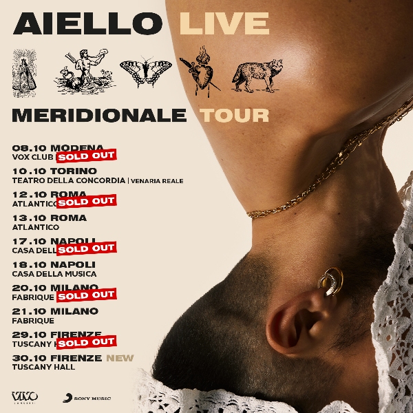 (TO), domenica 10, al Teatro della Concordia, e in seguito a Roma, per un doppio appuntamento all’Atlantico Live martedì 12 (sold out) e mercoledì 13. Successivamente AIELLO si esibirà alla Casa della Musica di Napoli domenica 17 (sold out) e lunedì 18, raddoppiando poi a Milano, al Fabrique, mercoledì 20 (sold out) e giovedì 21. Il tour si concluderà con un due date a Firenze, presso il Tuscany Hall, venerdì 29 (sold out) e sabato 30. Durante i live, AIELLO presenterà le canzoni contenute nel nuovo album “MERIDIONALE”, pubblicato il 12 marzo, tra cui “ORA”, brano presentato al 71° Festival di Sanremo che ha già raggiunto più di 6 milioni di stream e oltre 3 milioni di views, e i singoli “VIENIMI (a ballare)” (disco di platino) e “CHE CANZONE SIAMO”. Non mancheranno poi i suoi successi più acclamati, come “ARSENICO” (disco di platino) e “LA MIA ULTIMA STORIA” (disco d’oro).