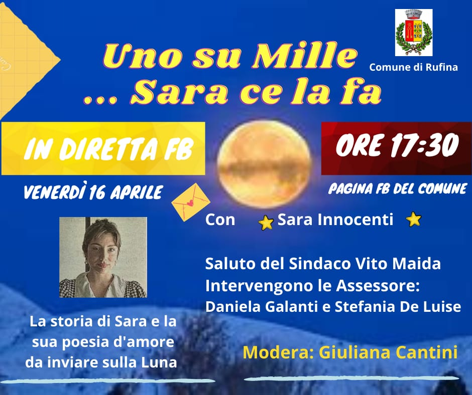 La giovane poetessa racconterà la sua storia venerdì prossimo, 16 aprile, alle 17,30 durante l’iniziativa “Uno su mille…Sara ce la fa” in diretta Facebook sul sito del Comune di Rufina.