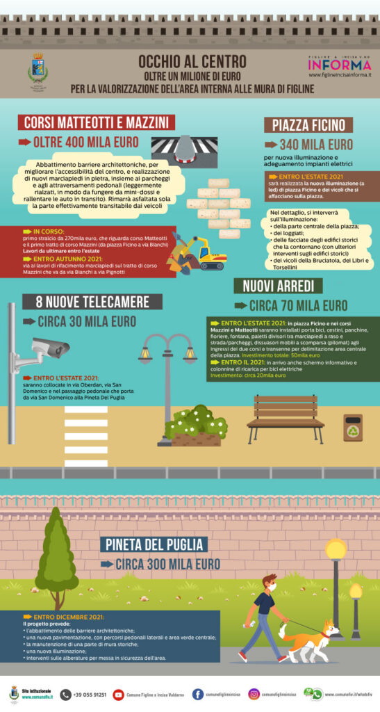 “Come anticipato nei mesi scorsi, in occasione dell’approvazione del Bilancio 2021 – spiega l’Amministrazione comunale – abbiamo voluto rispondere alle esigenze di residenti, commercianti e in generale di tutti quei cittadini che, in questi anni, hanno manifestato la volontà di assistere ad un rilancio del centro storico, per motivazioni legate sia alla sua vivibilità che alla sua vocazione commerciale. Per questo motivo, abbiamo scelto di dedicare grande attenzione e risorse economiche al centro storico di Figline, per renderlo più attrattivo e sicuro, prevedendo sia un pacchetto da oltre un milione di euro di lavori pubblici sia altre iniziative che puntano alla sua valorizzazione. L’obiettivo di questo doppio canale di azione è comune: riqualificare il cuore della città e renderlo più adatto alle esigenze di tutti, grazie all’abbattimento delle barriere architettoniche, all’implementazione dell’illuminazione, alla messa in sicurezza e ad ulteriori progetti in fase di redazione, dedicati all’area interna alle mura storiche. In vista dell’estate, accanto all’installazione di nuove telecamere che sono funzionali a mantenere il decoro della zona, stiamo lavorando infatti ad un Regolamento per il centro storico, che prevederà una serie di interventi che puntano a migliorare la quiete pubblica, il decoro e la promozione del territorio, anche attraverso la valorizzazione e la disciplina del commercio locale. In questo momento di grande difficoltà e di sofferenza. Per noi, oltre che un segnale di attenzione verso questa importante area della nostra città, è un modo per manifestare la nostra vicinanza anche alle attività commerciali che, in questo periodo di emergenza sanitaria, stanno soffrendo in maniera particolare degli effetti causati dalle restrizioni. Investire un milione di euro per la valorizzazione del centro, quindi, significa puntare non solo su un restyling funzionale ed estetico, ma anche sulla sua vivacizzazione, sulla sua vivibilità e sul renderlo un punto di incontro, di socializzazione e di promozione del commercio locale, con la speranza di poterlo vedere quanto prima pieno di cittadini e vivo”.