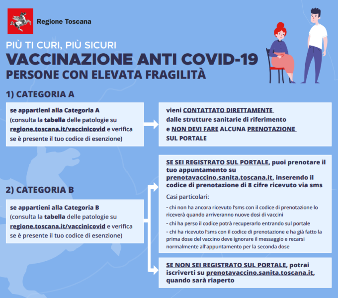 Nel frattempo la Regione Toscana ha realizzato per le persone “estremamente vulnerabili” un'infografica che spiega chi necessita di prenotazione e chi no, sulla base dell’area di patologia di appartenenza, le cui tabelle di riferimento sono su regione.toscana.it/vaccinicovid, che consentono di verificare la presenza proprio codice di esenzione.