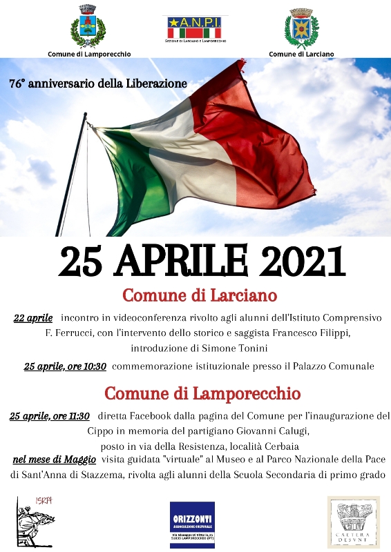 Anche quest'anno, a causa delle restrizioni imposte dalla perdurante pandemia, non possiamo organizzare, come avremmo voluto, le celebrazioni per il 76° anniversario della Liberazione, insieme all'Amministrazione di Larciano, ad ANPI sezione Larciano e Lamporecchio, ad Orizzonti, all'Accademia di Masetto e all'Istituto Storico della Resistenza di Pistoia. Ringraziamo tutti per aver cercato, nonostante le difficoltà, di essere presenti in questa importante ricorrenza, certi che non potrà mai esistere distanza o restrizione tale da impedire di portare avanti la memoria di chi ha sacrificato la propria vita per la nostra libertà.
