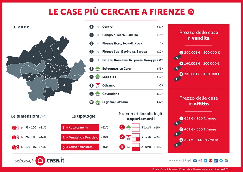 Le case più cercate si trovano nel centro di Firenze, infatti la zona è al primo posto delle zone più cercate su Casa.it con una crescita rispetto al bimestre dello scorso anno del +27%. Rimane stabile al secondo posto la zona Campo di Marte - Libertà che cresce comunque nelle ricerche del +15%. Stabile anche la zona Firenze Nord - Novoli - Nova non solo in classifica ma anche come quantità di ricerche.