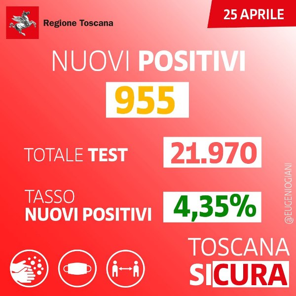 Contagi 25 aprile. I nuovi casi registrati in Toscana sono 955 su 21.970 test di cui 14.542 tamponi molecolari e 7.428 test rapidi. Il tasso dei nuovi positivi è 4,35% (12,0% sulle prime diagnosi). Sono questi i dati resi noti dal presidente della Regione Toscana Eugenio Giani in anticipo sul quotidiano bollettino che sarà pubblicato nelle prossime ore. Rispetto a ieri si registra un aumento dei nuovi positivi che da 886 passano oggi a 955.