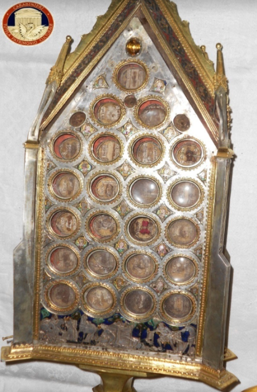 Tutti i preziosi reliquiari, le pissidi e i calici asportati nel corso del furto consumato nella notte tra il 10 e l’11 luglio 1989 ai danni del Museo del Seminario di Monteriggioni (SI), a eccezione di un calice tutt’ora da ricercare, sono stati recuperati dai Carabinieri del Nucleo per la Tutela del Patrimonio Culturale e ritornano oggi al proprio posto restituendo così alla collettività senese un significativo tassello della propria identità culturale e artistica.