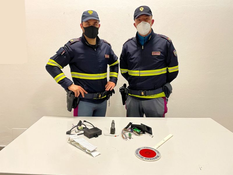 A bordo del Tir, ben nascosto dietro i cavi del cruscotto, gli agenti sono riusciti a scoprire l’esistenza di un marchingegno illegale che, quando azionato, ingannava la strumentazione di bordo facendo sembrare che il camion fosse fermo, mentre in realtà viaggiava, andando ad alterare le misurazioni e i dati registrati.
