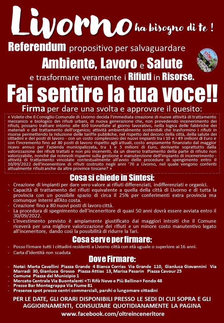 Invitiamo tutte le associazioni favorevoli alla necessaria transizione ecologica e industriale della nostra città nella logica di "Rifiuti Zero" e delle "Fabbriche di Materiali" ad aiutare nella raccolta delle firme perché se il referendum verrà approvato sarà la vittoria di tutti i cittadini.