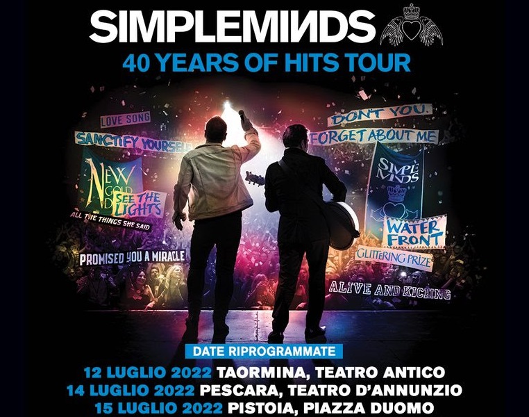 Riprogrammato per l’estate 2022 il “40 Years of Hits Tour” dei Simple Minds in Italia. Live Nation conferma le nuove date nelle stesse città nelle quali la band si sarebbe dovuta già esibire nel 2020 con il tour celebrativo della loro carriera, fermato per le restrizioni imposte dall’emergenza coronavirus e quindi riprogrammato nel 2021, fino a quando non è stato necessario l’ulteriore posticipo alla prossima estate. I biglietti già acquistati rimangono validi per le nuove date nel luglio 2022 e le prevendite sono aperte su Ticketone, Ticketmaster e Vivaticket.