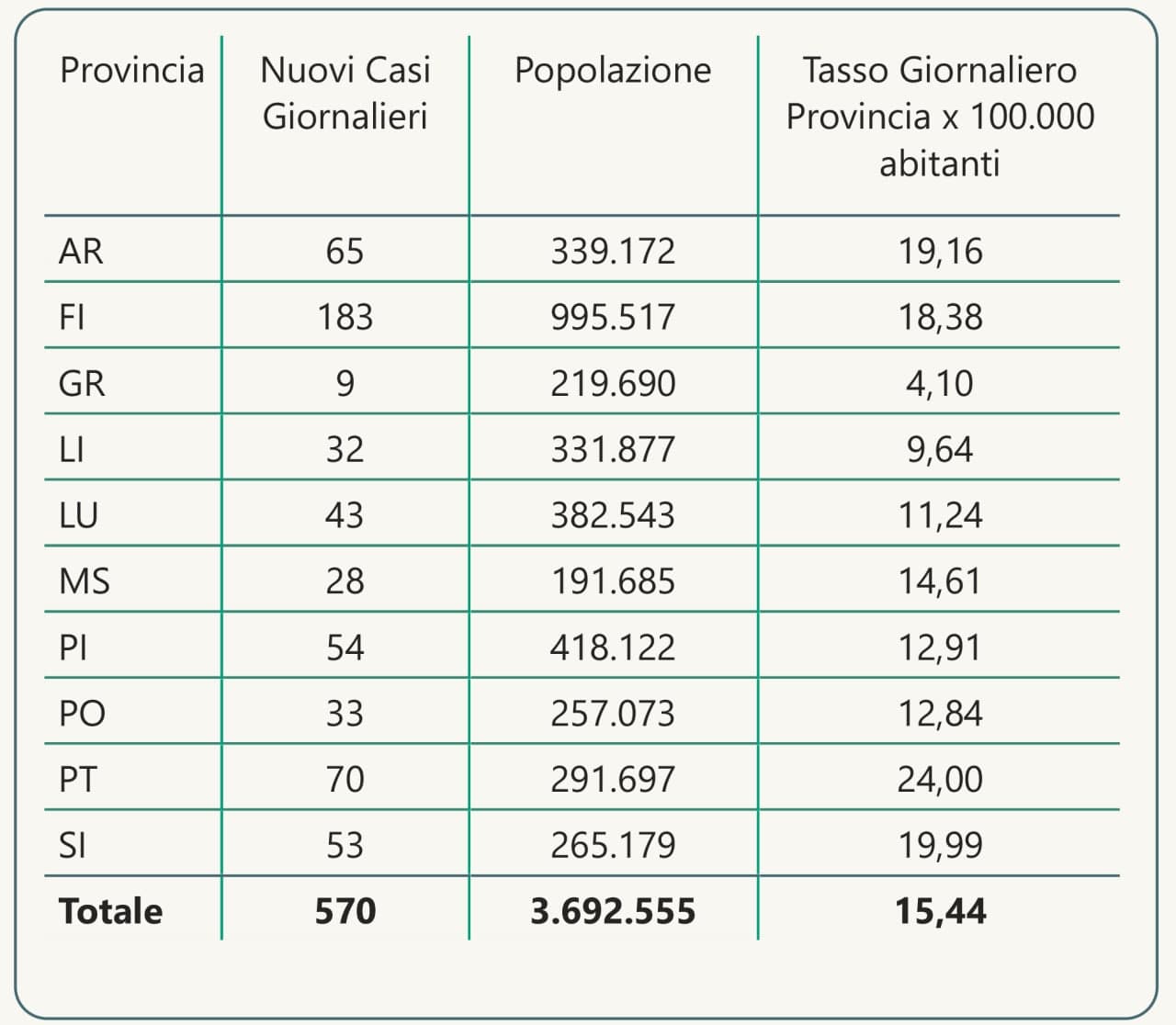 La Toscana si trova al 13° posto in Italia come numerosità di casi (comprensivi di residenti e non residenti), con circa 6.203 casi per 100.000 abitanti (media italiana circa 6.782 per 100.000, dato di ieri). Le province di notifica con il tasso più alto sono Prato con 8.097 casi per 100.000 abitanti, Pistoia con 7.380, Pisa con 6.703, la più bassa Grosseto con 3.699.