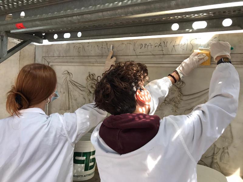 Per tutta la giornata di oggi, gli studenti dei corsi di restauro promossi dall'Istituto Spinelli, affiancheranno i docenti Steafano Landi e Daniela Manna, per condurre i test di pulitura anche con i solventi, di modo da valutare quale sia il metodo più efficace.