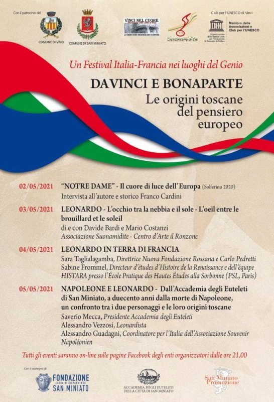 Sta proseguendo regolarmente “Da Vinci e Bonaparte. Le origini toscane del pensiero europeo”, un festival italo-francese, on line da domenica 2 a mercoledì 5 maggio e che vede il Club per l’Unesco di Vinci, Vinci nel Cuore e Suonamidite – le tre associazioni promotrici – impegnate nell’organizzazione degli eventi.