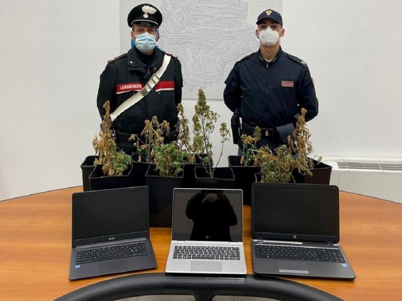A bordo del veicolo sono stati inoltre ritrovati tre computer, di proprietà di diversi istituti scolastici della zona. Le perquisizioni domiciliari hanno fatto rinvenire una serra artigianale che conteneva 9 piante di marijuana. Nel rito direttissimo sono stati convalidati gli arresti e disposta la custodia cautelare in carcere per il 39enne e la misura cautelare dell'obbligo di presentazione alla polizia giudiziaria a Carrara per la 27enne. L'attività investigativa, tra questura e carabinieri, ha ricostruito almeno cinque episodi di furti compiuti dai due fidanzati. Danni e materiale prelevato sono ancora in corso di quantificazione.