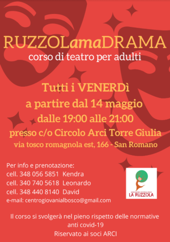 L'altra novità è il corso di teatro per adulti che si svolgerà tutti i venerdì dalle ore 19 alle ore 21 a partire dal venerdì 14 maggio. Per informazioni potete contattare i seguenti numeri di telefono 3480565851 Kendra e 3407405618 Leonardo. Per le iscrizioni ai due corsi potete scrivere all'indirizzo email centrogiovanialbosco@gmail.com, oppure direttamente in orario del corso.