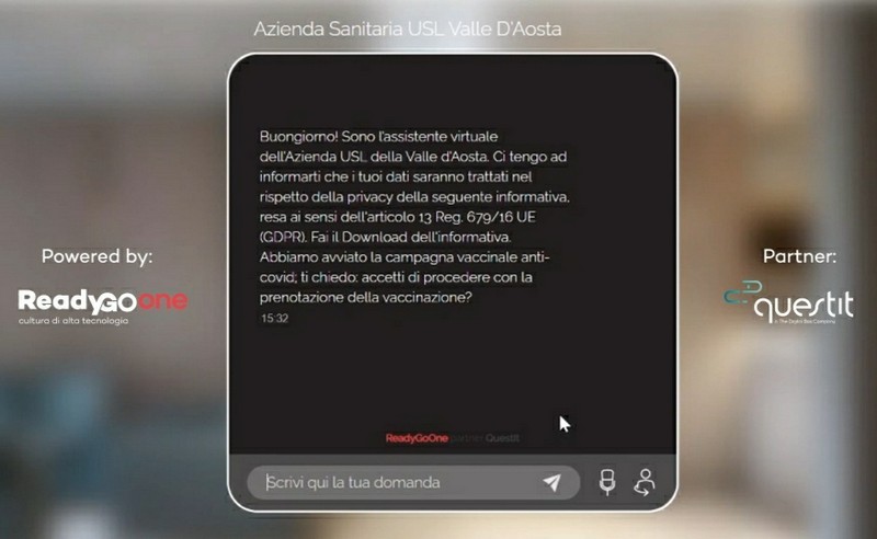 Concepita in seno all’Università di Siena e portata nella regione del Monte Bianco da Ready Go One – società nata dalla partnership tra Readytec e Go2Tec, attiva nei campi dell’intelligenza artificiale, cybersecurity e cloud computing – Dora è una vera e propria intelligenza artificiale: programmata con l’algoritmo di elaborazione del linguaggio naturale creato da Questit (società partecipata del gruppo The Digital Box, Readytec ed Exprivia), è in grado di telefonare alle persone interessate dalla campagna vaccinale, porre domande e comprenderne le risposte in modo da fissare la prenotazione nel giorno concordato con l’utente. In più, da brava segretaria, richiama l’interessato qualche giorno prima della data fatidica, come promemoria.