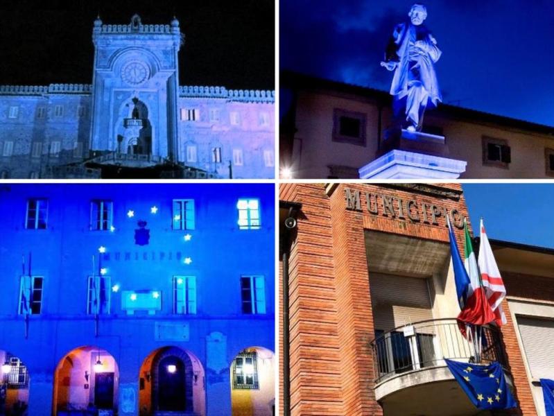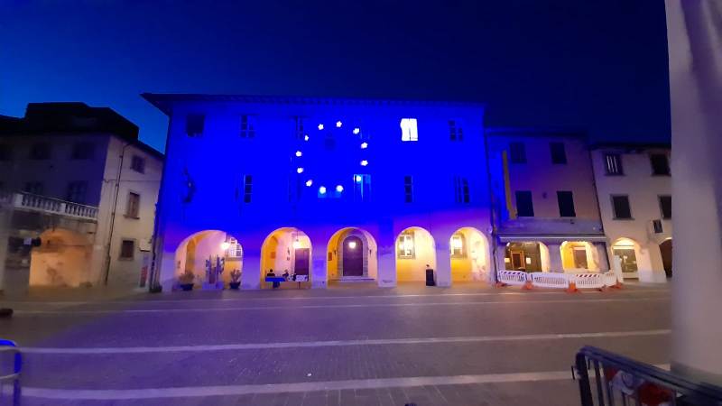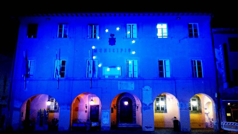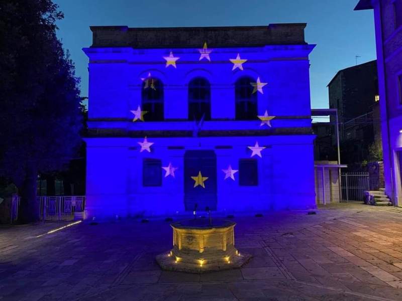 "Il nostro municipio diventa azzurro per la festa dell'Europa. La bandiera dell'Unione illumina la notte di Cascina" scrive il sindaco Michelangelo Betti su facebook.