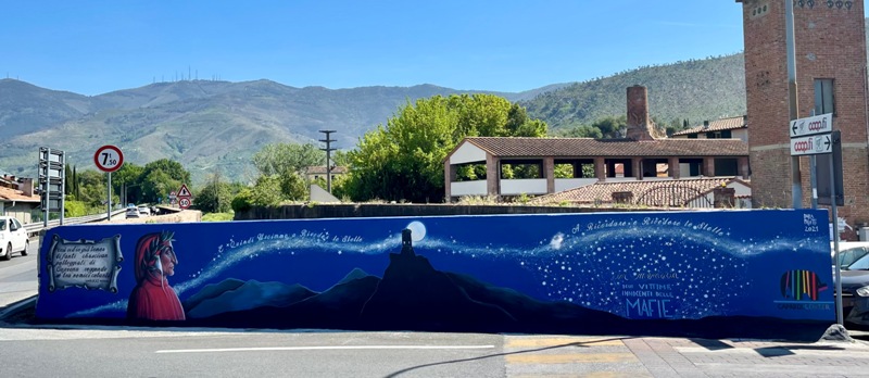 "L'idea del Murale - ha aggiunto l'Assessora alla Legalità, Fabiola Franchi - è nata dall'Amministrazione accogliendo le richieste di alcuni cittadini di Caprona che volevano riqualificare questo muro sulla Zambra. Il resto è storia ed è arte e sensibilità, quelle di Daria Palotti, straordinaria pittrice e scultrice. Il murale accoglie Dante, visto che Caprona è cantata nella Divina Commedia, lo ricorda anche una epigrafe recentemente restaurata nel giardino di Via delle Cave, e visto che Avviso Pubblico, promuovendo la Giornata per le vittime innocenti delle mafie, ricorrendo nel 2021 il 700° anniversario della morte di Dante, ha scelto come slogan 'a ricordar e rivedere le stelle', unendo Divina Commedia e cultura della Memoria. Il murale è la rappresentazione artistica di questa frase, di questo nobile intento."